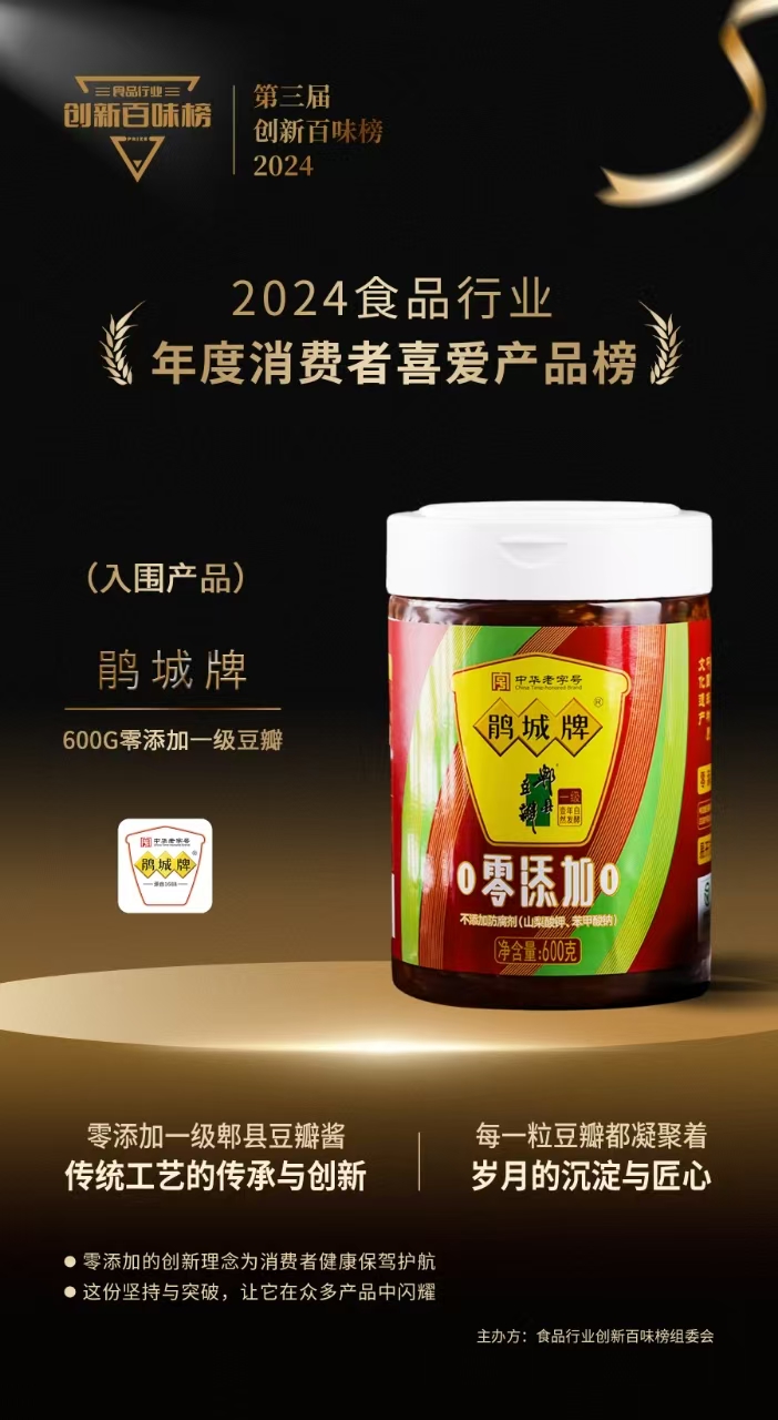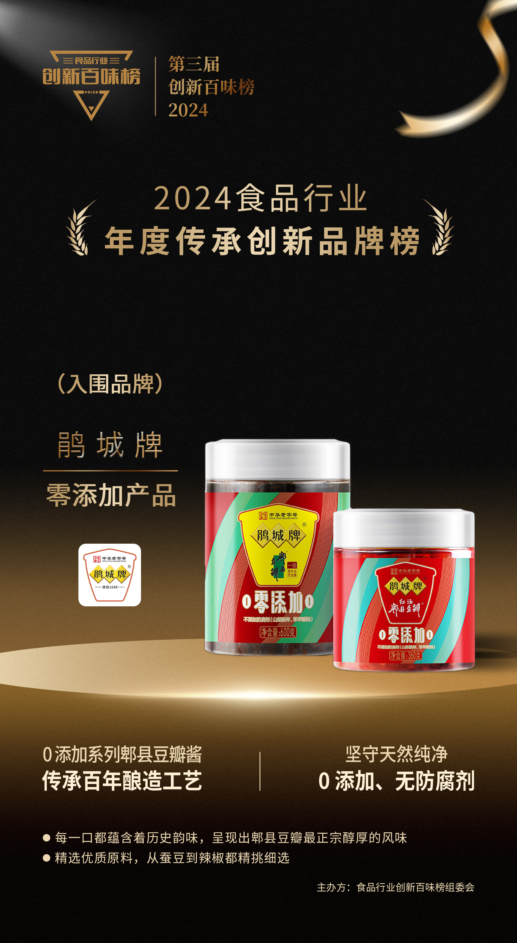 在此次盛典備受矚目的 2024 食品行業創新百味榜揭曉環節中,鵑城牌郫縣豆瓣憑借其百年傳承的獨特風味和始終如一的卓越品質脫穎而出,榮登“2024 食品行業年度傳承創新品牌榜”以及“2024 食品行業年度消費者喜愛產品榜”,一舉斬獲雙項殊榮,成為全場焦點之一。