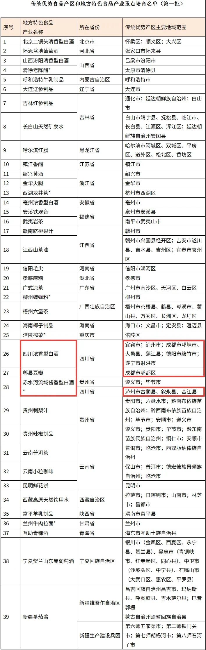 2025年6月4日,工業和信息化部正式發布《首批傳統優勢食品產區和地方特色食品產業重點培育名單》,全國39個特色產業入選。四川濃香型白酒、郫縣豆瓣、赤水河流域醬香型白酒作為川味“金三角”集體上榜,標志著川渝食品工業進入國家戰略培育梯隊。