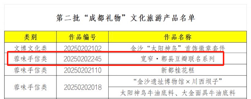 近日,成都文化旅游產品協會組織開展的第二批次 “成都禮物” 文化旅游產品遴選結果正式揭曉。鵑城牌郫縣豆瓣文旅系列產品憑借深厚的文化底蘊、獨特的創意設計及卓越的產品品質成功入選。
